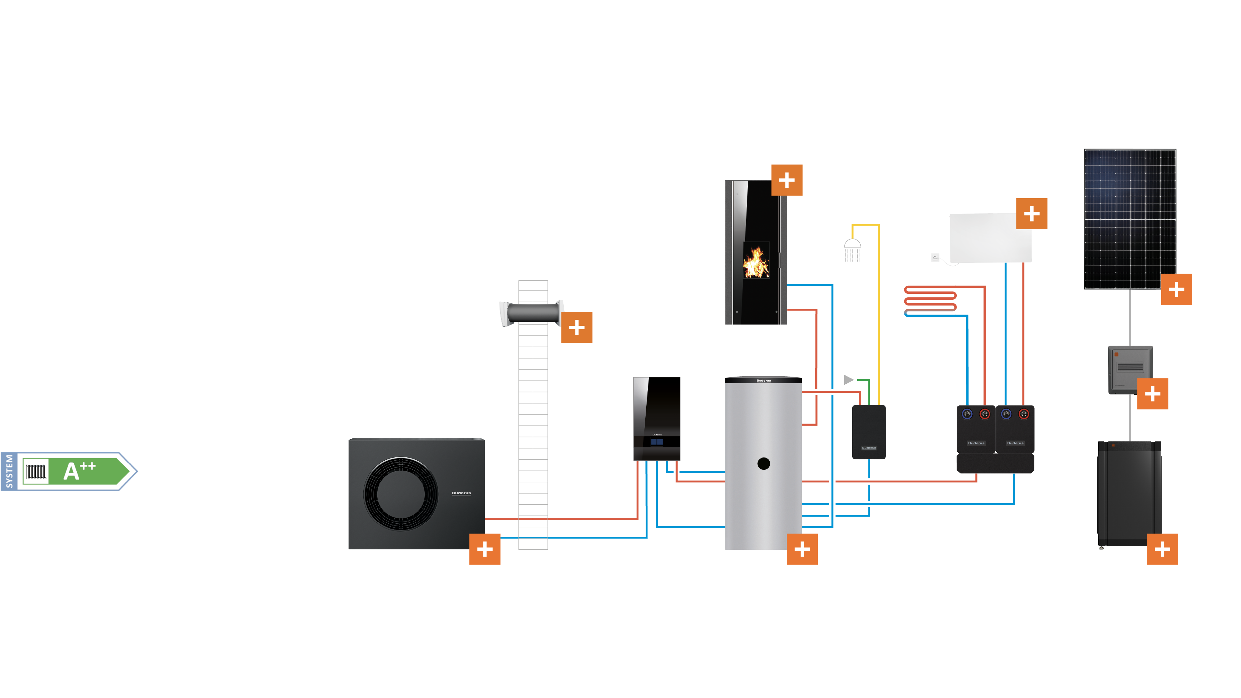 Der von dem Photovoltaik-System erzeugte Strom versorgt das Wärmepumpen-System und die Elektrogeräte im Haus. Durch die Ergänzung eines Batteriespeichersystems erhöht sich der Eigenverbrauchsanteil und der selbst erzeugte Strom steht auch unabhängig von der Sonneneinstrahlung zur Verfügung. Die Inbetriebnahme des Photovoltaik-Systems und die Integration in das Wärmepumpen-System gehen dank der intuitiv bedienbaren Buderus App MyEnergyMaster leicht von der Hand.