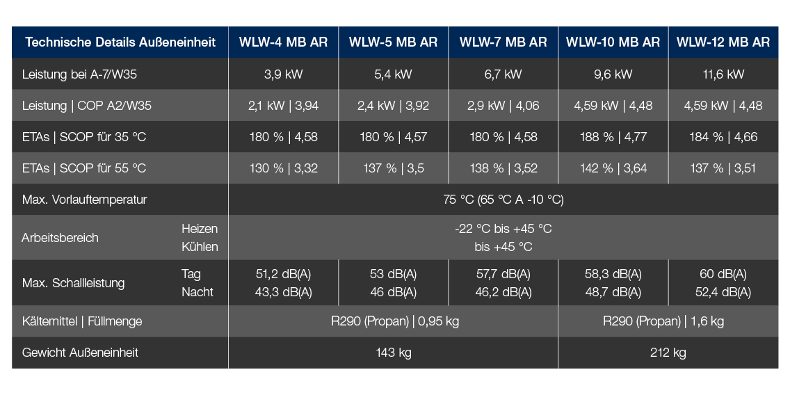 • sehr leise Wärmepumpen-Außeneinheit, die auch auf kleinen Grundstücken aufgestellt werden kann